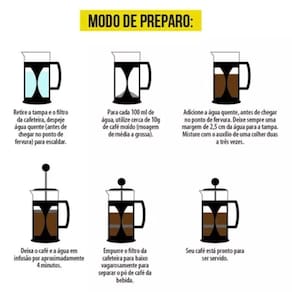 Modo de uso da cafeteira 1. Remova o topo e o filtro da cafeteira; 2. Insira o cafe moido 3. Esquente a agua 4. Mexa 5. Coloque a parte de cima de volta com o filtro todo levantado 6. Deixe a infusao por quatro minutos 7. Pressione o filtro gentilmente e seu cafe estara pronto