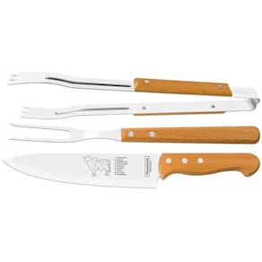 Características do produto: Cor: Madeira Modelo: Madeira Natural Marca: Tramontina Fabricante: Tramontina Sessão: Facas Quantidade de Peças:3 Peças Lâminas de aço inox. As lâminas das facas têm maior durabilidade do fio devido ao tratamento térmico. O garfo e pegador contam com maior espessura e uma estampagem do aço que garante maior resistência, evitando deformações. Os cabos são de madeira natural. Rebites de alumínio.