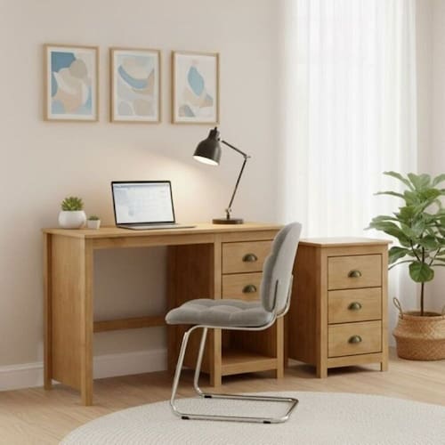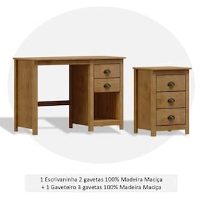 O Conjunto Topázio da Finestra Móveis é ideal para escritório ou home office, composto pela Escrivaninha 2 Gavetas e pela Mesa de Cabeceira/Gaveteiro 3 Gavetas. Ambos são 100% produzidos em madeira maciça de pinus com acabamento em verniz PU/UV acetinado Branco/Freijó, garantindo durabilidade e sofisticação. A escrivaninha oferece amplo espaço para notebooks, materiais de escritório e organização diária, enquanto a mesa de cabeceira pode ser usada como gaveteiro independente, com três gavetas e corrediças telescópicas, perfeita para documentos e suprimentos. Um conjunto versátil que combina praticidade, elegância e funcionalidade para seu ambiente de trabalho em casa. Suporta Até (kg): 10 kg Acabamento: Pintura UV Altura do Conjunto: 76.5 cm Ambiente: null Ambiente Principal: Escritório Cor: Freijó Informação Complementar: 1x Mesa de Cabeceira 3 Gavetas Topázio 100% Madeira Maciça para Quarto Freijó Largura: 46,0 cm Altura: 68,0 cm Peso: 12,05 kg Profundidade: 41,0 cm Necessita Montagem: Sim