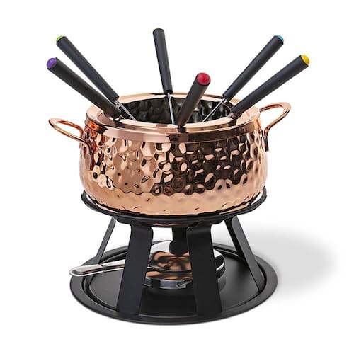 O Conjunto para fondue 11 peças da Brinox é ideal para o preparo de fondue de carne, queijo ou chocolate. Trazendo a tendência da decoração para o conjunto, sua caçarola em aço inoxidável possui revestimento na cor cobre com acabamento martelado. O kit é composto por: 1 base em aramado Ø17cm de diâmetro e 9,5cm de altura 1 prato de ferro 1 fogareiro em aço inox 1 caçarola 1 separador em aço inox revestido em cobre Ø 17,8 x 9,4cm e Ø 16,5 x 0,9cm 6 garfinhos em aço inox com cabos coloridos em polipropileno Torne o clima da sua casa aconchegante com o conjunto para fondue. Recipiente em Aço inox revestido com cobre. Acabamento martelado. Garfinhos em aço inox com cabo PP. Ideal para fondue de carne, queijo ou chocolate. Ean: 7896502841233