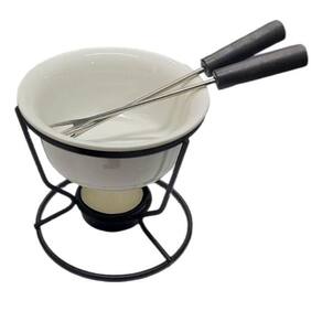 - Dimensões da Peça: 1 Panela: 10 x 10 x 4cm 1 Suporte: 10 x 9cm 2 Garfos: 14cm 1 Vela: 4cm - Material: Aço Inox, Cerâmica e PP.