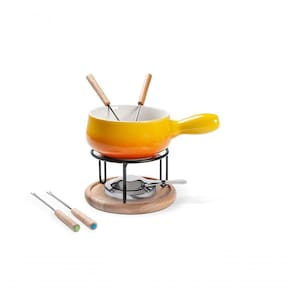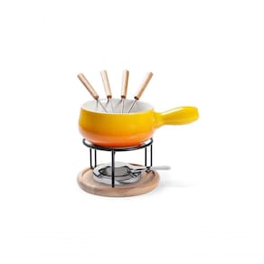 O Conjunto para Fondue 9 peças da Brinox é ideal para o preparo de Fondue Queijo e chocolate. Seu recipiente em cerâmica possui a cor externa em amarelo degradê e interna em branco. O Conjunto possui uma base de madeira: 16,4x1,8cm, um suporte preto: 13,6x7,6cm, uma base alumínio: 11,2x0,1cm, um fogareiro: 15,2 x 9,2 x 4,2cm, um recipiente em cerâmica: 22,5x15x7,6cm, e 4 garfos em aço inox com cabo em pp: 1,3x20,8cm. Torne o clima da sua casa aconchegante com o conjunto para fondue.