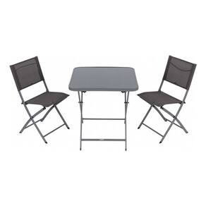 "Transforme seu espaco ao ar livre em um refugio relaxante com o Conjunto de Moveis para Jardim da colecao Emys. Com um design contemporaneo e elegante cor cinza escuro, este conjunto de moveis e composto por uma mesa quadrada e duas cadeiras dobraveis, perfeitas para refeicoes ao ar livre. Cada peca e cuidadosamente construida em aco resistente, garantindo durabilidade e resistencia ao longo do tempo.