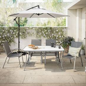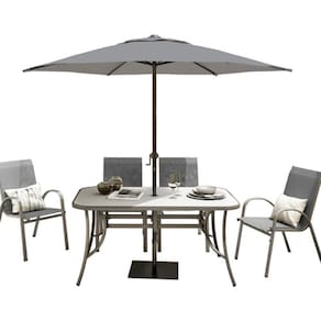 "Transforme seu jardim ou varanda em um espaco de convivencia e lazer com o Conjunto de Moveis para Jardim da colecao Alma da marca Naterial. Composto por uma mesa e quatro cadeiras, este conjunto oferece um design moderno e sofisticado na cor cinza, combinando facilmente com qualquer estilo de decoracao. A mesa apresenta um tampo de vidro que agrega elegancia ao conjunto, enquanto as cadeiras, tambem em cinza, possuem assento e encosto em tecido Textilene, proporcionando conforto extra durante as refeicoes.