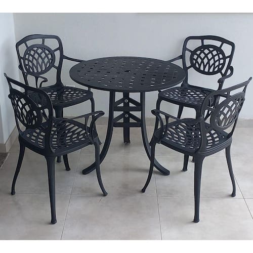 Especificações: 1 Mesa: 73 cm de altura x 80 cm de diâmetro. 4 Poltronas: 83 cm de altura x 41 cm de profundidade x 60 cm de largura. Cor: Preto Fosco. Material: Alumínio fundido. Tipo de pintura: Eletrostática. Vendemos almofadas separadamente. Requer montagem.