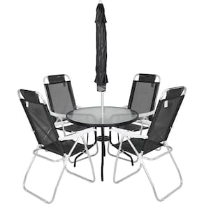 Conjunto para Jardim Mesa com Tampo de Vidro e 4 Cadeiras e Ombrellone Noronha Bel Desfrute do melhor em lazer com o Conjunto Noronha de 6 pecas! Inclui uma mesa redonda de centro com tampo de vidro temperado de 5mm e estrutura resistente de aluminio. Voce tambem tera um ombrellone articulado em bagum reforcado, equipado com varetas em fibra de vidro para maior durabilidade. Alem disso, o conjunto conta com 4 cadeiras individuais reclinaveis em 4 posicoes, oferecendo conforto personalizado. Seus encostos e assentos sao feitos de poliester de alta qualidade, revestidos com PVC para facil limpeza, enquanto a estrutura de aluminio garante leveza e resistencia. Com o Conjunto Noronha, seu espaco de lazer sera transformado em um ambiente de relaxamento e estilo incomparaveis!