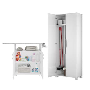 O Conjunto Lavanderia é ideal para você que gosta de funcionalidade e praticidade na sua área de serviço. Composto por um Armário que possui ganchos na parte interna para guardar vassouras e rodos, além de prateleiras para organizar outros objetos, como baldes e produtos de limpeza. A Tábua de Passar Criativa possui suporte aramado para o ferro de passar garantindo maior segurança e internamente possui uma prateleira para uma melhor organização dos objetos.