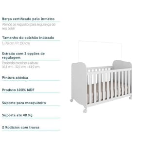 Conjunto para Quarto de Bebê 1 Berço Americano Uli 1 Guarda Roupa Júnior Móveis Peroba Branco Brilho. Se você procura por qualidade segurança e aquele toque clássico para montar o quarto do seu bebê, essa proposta vai te encantar. Os produtos são desenvolvidos em 100% MDF e acabamento em pintura UV atóxica, garantindo maior segurança para toda família. O berço possui estrado com regulagem de altura em 3 posições, proporcionando acesso confortável ao bebê conforme seu crescimento. Ele também conta com bordas arredondadas, 4 rodízios, sendo 2 com travas e registro no Inmetro. No guarda roupa, vemos muito espaço interno para organização com cabideiro metálico e 5 prateleiras. As gavetas possuem corrediças metálicas, facilitando o deslize. Guarda Roupa acompanha 2 rodapés, um torneado e um reto, que você escolhe qual usar no momento da montagem. Um detalhe que oferece muito charme. Ean: 7909903202951