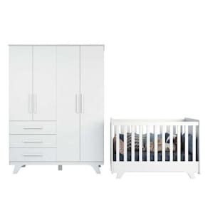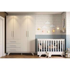 Conjunto para Quarto de Bebê com Guarda Roupa 4 Portas 3 Gavetas e Berço Retrô Móveis Peroba Branco Brilho. Inspirado no estilo retrô do passado com um toque de modernidade a linha Retrô da Móveis Peroba é encantadora. O berço é certificado pelo INMETRO no registro 000781/2018, tem a opção de ser utilizado como mini cama, acompanha um suporte para mosquiteiro e a base do colchão é regulável em 3 opções de altura, aumentando o conforto no uso diário e na segurança com o crescimento do seu pequeno(a). São móveis com acabamento em pintura UV atóxica e com a qualidade de ser produzido em 100% MDF. As gavetas possuem corrediças telescópicas e suportam até 4kg cada. Tudo para oferecer um quartinho aconchegante, pratico e lindo para o seu bebê. Ean: 7909903169698