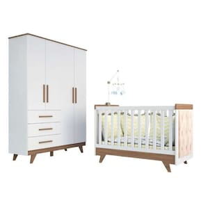 Conjunto para Quarto de Bebê com Guarda Roupa 4 Portas e Berço com Capitone Retrô Móveis Peroba Branco Brilho/Carvalho/Pena Areia. Inspirado no estilo retrô do passado com um toque de modernidade a linha Retrô da Móveis Peroba é encantadora. O berço é certificado pelo INMETRO no registro 000781/2018, tem a opção de ser utilizado como mini cama, acompanha um suporte para mosquiteiro e a base do colchão é regulável em 3 opções de altura, aumentando o conforto no uso diário e na segurança com o crescimento do seu pequeno(a). São móveis com acabamento em pintura UV atóxica e com a qualidade de ser produzido em 100% MDF. As gavetas possuem corrediças telescópicas e suportam até 4kg cada. Tudo para oferecer um quartinho aconchegante, pratico e lindo para o seu bebê. Ean: 7909903169766