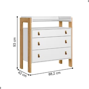 A cômoda é feita em MDP 15/12mm, possui três gavetas com corrediças metálicas