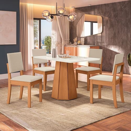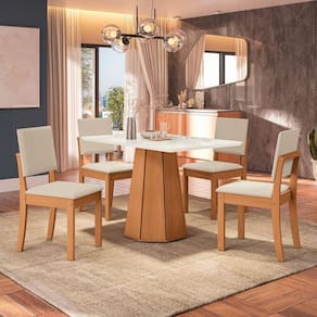 Para todos os momentos, aposte no Conjunto CSJ1681CN da Linha Sala de Jantar Kappesberg. Em MDP e pintura touch na cor canela, a base é circular com formato octagonal, medindo 77cm de altura e 52cm de diâmetro. Combinada ao tampo retangular, em MDF 3cm na cor off white, o destaque fica para o vidro na mesma cor. Com 120cm X 80cm, ele suporta até 90kg, acomodando quatro pessoas. Já as cadeiras, em MDF e 93,5m de altura, sendo 50cm a altura do assento, 42cm de largura e 54cm de profundidade, e estrutura em pintura touch na cor canela, suporta até 120kg. Entregue desmontada, tanto o encosto quanto o assento são estofados e recobertos com tecido linho areia. O destaque é a estrutura, e o detalhe atrás do encosto pode ser utilizado como puxador, deixando a composição mais completa.