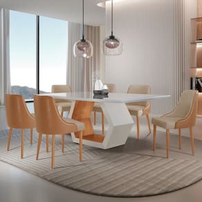 Dê um toque de sofisticação à sua sala de jantar com o conjunto Sarah e Cadeiras Roma. A mesa, com 180cm, combina perfeitamente com ambientes modernos e acolhedores, oferecendo espaço ideal para reunir a família e os amigos em ocasiões especiais.