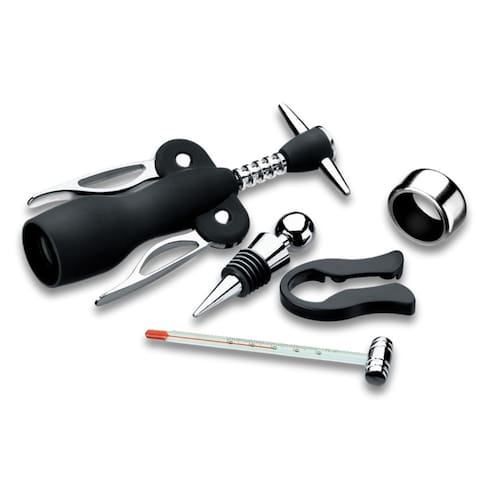 Marca: Brinox Modelo: Acessórios de Vinho Características O Conjunto para Vinho Brinox é um produto indispensável para os apreciadores da bebida. É composto por cinco peças essenciais: Saca-Rolhas, Tampa, Termômetro, Anel e Cortador para Cápsula. Para servir e degustar com muita mais praticidade e elegância. É uma ótima opção de presente! INFORMAÇÕES: AMBIENTE: Cozinha MATERIAL: Aço Inox LINHA: Acessórios para Vinho e Espumante TIPO DE PRODUTO: Utensilios Para Bar COMPOSIÇÃO: 01 Tampa para Vinho 01 Cortador para Cápsula 01 Termômetro 01 Anel para Garrafa 01 Saca-Rolhas : 6 Meses Marca: Não Informado