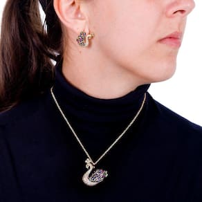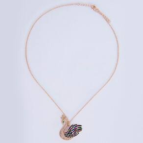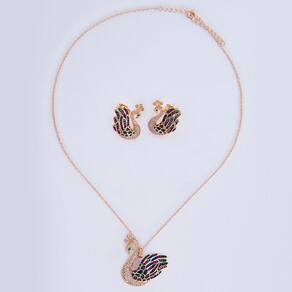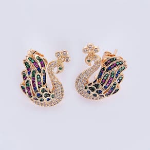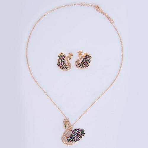 Conjunto de colar e brincos em formato de pavão é banhado a ouro com aplicação de zircônias cristais e coloridas é único luxuoso que te deixa em destaque em qualquer situação.