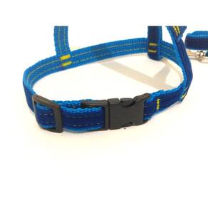 Peitoral confeccionado em tecido de veludo liso e nylon; Presilha com regulagens de tamanho em plastico resistente; Guia em tecido de veludo liso e nylon; Mosquetão médio com trava de segurança; Indicado para cachorros de pequeno e médio porte. Cor: azul