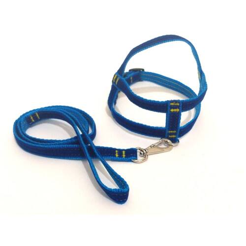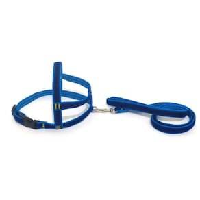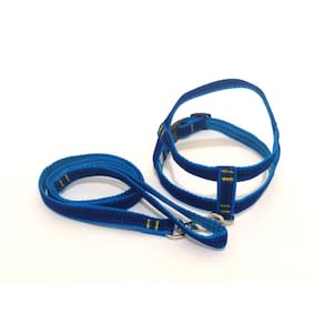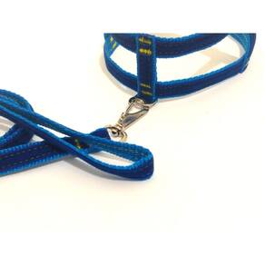 Peitoral confeccionado em tecido de veludo liso e nylon; Presilha com regulagens de tamanho em plastico resistente; Guia em tecido de veludo liso e nylon; Mosquetão médio com trava de segurança; Indicado para cachorros de pequeno e médio porte. Cor: azul