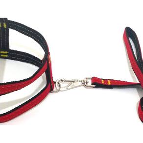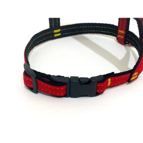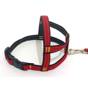 Peitoral confeccionado em tecido de veludo liso e nylon; Presilha com regulagens de tamanho em plastico resistente; Guia em tecido de veludo liso e nylon; Mosquetão médio com trava de segurança; Indicado para cachorros de pequeno e médio porte. Cor: vermelho com preto.