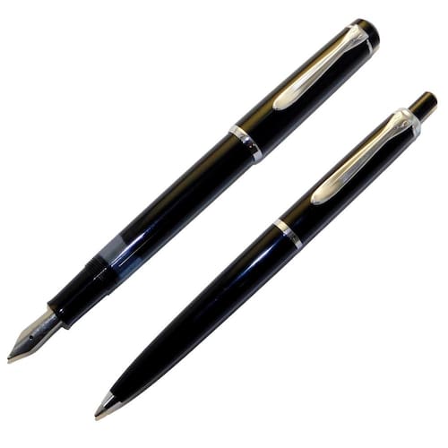 A Pelikan M100 é a menor caneta tinteiro da família Pelikan, apresentando o tradicional mecanismo de enchimento a pistão. Com uma resina preta de alta qualidade polida à perfeição, essa coleção clássica se destaca pelos anéis decorativos cromados e o icônico clipe de bico da Pelikan, evidenciando seu design tradicional. Inclui uma elegante janela de visualização de tinta. Formando o par com a caneta tinteiro, temos uma caneta esferográfica com acionamento por meio de botão. Produto New Old Stock, sem uso, fabricado na antiga Alemanha Ocidental, com a inscrição W. Germany no anel da caneta. Raridade.