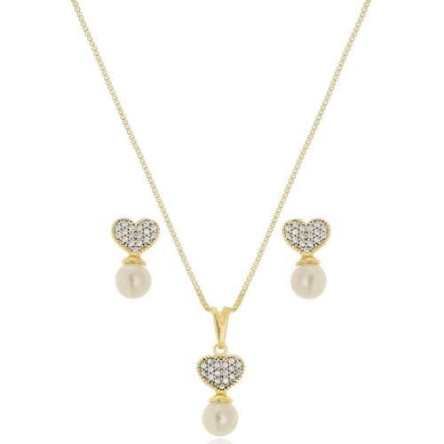 Conjunto Pérola Coração Banhado a Ouro 18k 3405 Conjunto: corrente medidno 45cm de comprimento om pingente pérola de 4mm e coração em zirconia na base e so brincos no mesmo modelo.