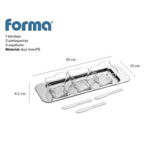 Composição do produto: 1 bandeja 3 petisqueiras 3 espátulas Material: Aço Inox/PS Dimensões: 30 x 10 x 4,2 cm Peso: 295 gramas