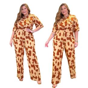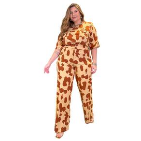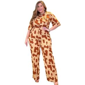 CONJUNTO ESTAMPADO COM CALCA E BLUSA COM BOLSOS E MARTINGALE. O conjunto apresentado é um exemplar de moda plus size que exala confiança e estilo. O design emprega uma estampa de inspiração animal, mais especificamente em manchas reminiscentes de uma girafa, em tons de marrom terroso e bege suave, o que proporciona um visual ao mesmo tempo ousado e sofisticado. A blusa possui um corte moderno, com mangas curtas e decote discreto, acentuado por dois botões grandes que agregam um charme vintage à peça. As calças de corte reto complementam a blusa, criando uma silhueta alongada e elegante. O tecido parece ser de uma qualidade que oferece tanto conforto quanto durabilidade, ideal para um dia de trabalho ou um evento casual chic. A modelagem valoriza as curvas, evidenciando a beleza natural do corpo plus size. Blusa: Estampa animal em tons de marrom e begeTecido leve e confortávelMangas curtas com ampla aberturaDecote redondo com detalhe de botõesCorte solto que valoriza a silhuetaCalças: Estampa coordenada com a blusaCorte reto que alonga a silhuetaTecido resistente com caimento suaveCós alto para maior confortoFechamento prático e discreto Composição: 70% Viscose 30% Linho Composição Forro: 100% Elastano Marca: Predilect´s