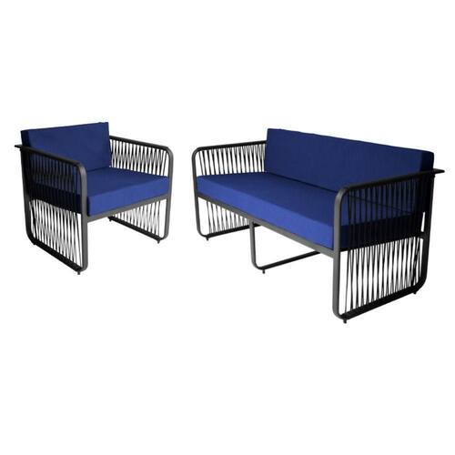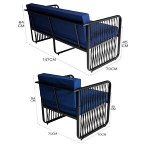 Conjunto Poltrona E Namoradeira Corda Náutica Santiago Preto/azul O Conjunto Santiago foi desenvolvido para oferecer um toque de sofisticacao e conforto a sua area externa. Com estrutura em aluminio e acabamento em corda nautica, este conjunto e ideal para quem deseja unir durabilidade e elegancia. O assento e encosto macio e confortavel com tecido impermeavel, tornando-o perfeito para espacos como areas gourmet, varandas, areas de churrasqueira e ediculas.