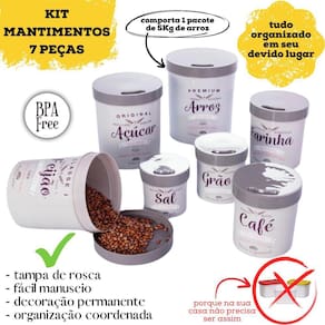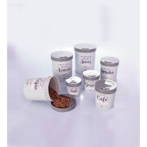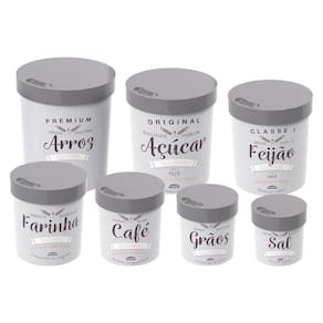 Conjunto de Porta Mantimentos redondo Retrô com 7 peças decorado, com tampa de rosca em todas as peças, ideal para armazenar os mantimentos mais básicos de casa, sendo 1 Pote de 800ml sugerido para SAL, 1 Pote de 1,2L sugerido para GRÃOS, 1 Pote de 1,8L sugerido para CAFÉ, 1 Pote de 2,5L sugerido para FARINHA, 1 Pote de 3,4L sugerido para FEIJÃO, 1 Pote de 4,4 L sugerido para AÇÚCAR e 1 Pote de 5,7L sugerido para ARROZ (comporta 1 pacote de arroz de 5Kg).