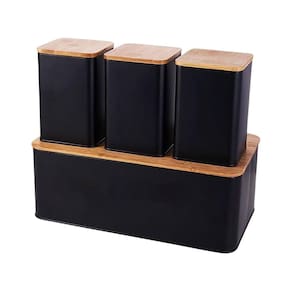 Contém: 4 recipientes Material: Metal e Bambu Porta Pão: 33x18x12 cm Potes: 10x10x12 cm Cor: Preto Marca: Mimo Style