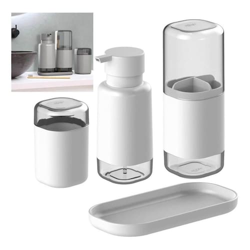 Itens inclusos na embalagem: - 1 unidade do porta escova de dente dual - 1 unidade do porta sabonete líquido 500ml dual -1 unidade porta algodões -1 unidade da bandeja dual