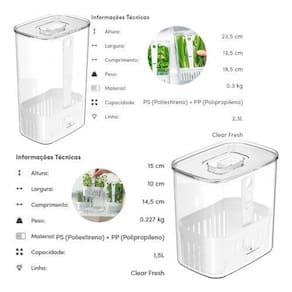 Kit 2 Porta Temperos Frescos - OU Organizador de Geladeira para Ervas, Folhas e Hortaliças Conservação Prolongada 1,5L + 2,3L Mantenha seus temperos, ervas frescas e hortaliças sempre organizados e conservados com o Kit Porta Temperos Frescos da OU Composto por dois tamanhos práticos 1,5L e 2,3L , esse kit é ideal para quem busca preservar o frescor natural dos alimentos por mais tempo na geladeira, sem ressecar ou perder sabor. Projetados para armazenar folhas delicadas como salsinha, coentro, hortelã, rúcula e muito mais, os potes contam com design funcional e espaço para adicionar água na base, criando um ambiente úmido controlado, perfeito para prolongar a durabilidade dos alimentos. O que vem no kit: 1 Porta Temperos Frescos 1,5L - OU 1 Porta Temperos Frescos 2,3L - OU Destaques do Produto: Conservação Máxima e Natural: Espaço interno que permite adicionar água para manter folhas hidratadas e frescas por muito mais tempo. Tampa Fechada que Protege sem Ressecar: Conserva o frescor dos alimentos e evita contaminações com odores da geladeira. Visual Clean e Transparente: Permite ver o conteúdo sem abrir, facilitando a organização. Dois Tamanhos para Diferentes Usos: Use o de 1,5L para pequenas porções ou ervas delicadas. O de 2,3L é ideal para folhas maiores ou maior quantidade de temperos. Material Resistente e Livre de BPA: Fácil de lavar e reutilizar sempre que necessário. Marca: Não Informado