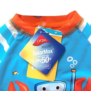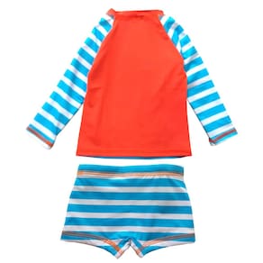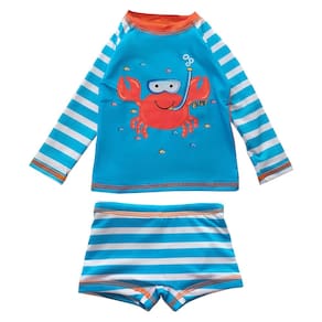 Leve diversão e segurança para os dias ensolarados com O conjunto de praia bebê listrado Everly. Com uma alegre e divertida estampa de siri mergulhador frontal, mangas, e sunga boxer listrada e costas coral neon. A sunga possui cordão de regulagem. Proteção UV 50+. Esse conjunto garante que seu bebê estará protegido dos raios solares enquanto aproveita o verão com estilo.