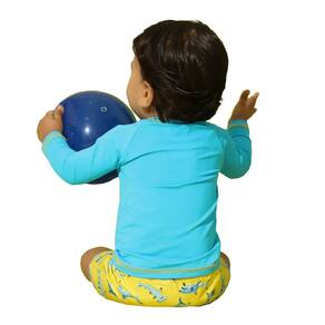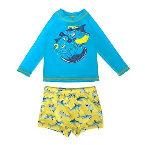 Leve diversão e segurança para os dias ensolarados com o conjunto de praia bebê azul e amarelo Everly. Com uma alegre e divertida estampa de tubarões frontal e mangas e costas azul vivo. A sunga boxer amarela com estampa de tubarões possui cordão de regulagem. Proteção UV 50+. Esse conjunto garante que seu bebê estará protegido dos raios solares enquanto aproveita o verão com estilo.