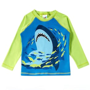 O Trio Camiseta e 2 Shorts Praia Infantil Tubarão Verde Neon da Tip Top é perfeito para os pimpolhos aproveitarem a praia ou piscina com todo conforto e proteção, e ainda com a opção de variar o look. Uma sunga boxer é estampada com tubarões e a outra é listrada. Possui proteção solar UV 50+ permanente.