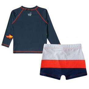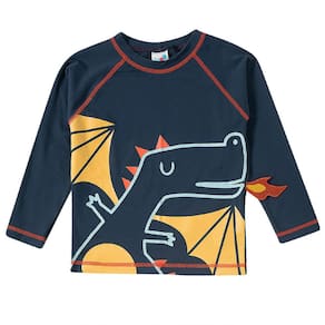 O Conjunto Praia Infantil Dragão com proteção solar FPS 50+ permanente é super leve, confortável e seguro, além de lindo e estiloso. O detalhe fica por conta do aplique de fogo na camiseta. É o conjunto que o seu pimpolho precisa para curtir a praia ou a piscina com toda a proteção, sem perder a liberdade dos movimentos.
