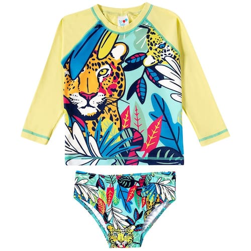 O Conjunto Praia Menina Proteção UV Onça Tropical da Tip Top é ideal para as pimpolhas poderem aproveitar a praia com todo estilo e proteção. Possui proteção solar permanente (FPS 50+) tem design moderno e confecção em tecidos leves.