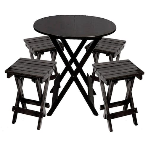 Conjunto De Mesa Dobravel De Madeira 60cm Redondo Com 4 Banquinhos Dobraveis PretoTenha um pacote completo de praticidade com este conjunto, ideal para restaurantes, bares, estabelecimentos comerciais, áreas de lazer ou até mesmo para sua casa. Feito em madeira maciça, resistente e durável. Seu design permite que seja encaixado em vários ambientes trazendo um toque estético a mais ao mesmo. Além de estética, este conjunto de mesas e cadeiras também garante praticidade de locomoção dos produtos e longa durabilidade.ATENçãO: EVITE USAR PRODUTOS ABRASIVOS E QUíMICOS PARA LIMPEZA DO PRODUTO, aconselha-se o uso de pano umedecido para melhor conservação; mantenha o produto fora de chuva e sol constantes.Matéria prima:Madeira Maciça, de alta densidade e resistente.Sua variação de tonalidades é uma característica típica desta madeira, podendo apresentar diversos tons num mesmo produto em harmonia com o brilho do verniz.Modelo: DobrávelCor: Preto Dimensões (Mesa): Altura 90cm / Largura e Profundidade 60cm (Diâmetro)Dimensões (Cadeiras): Altura 55cm / Largura 31cm / Profundidade 29cmConjunto Premium de Mesa Dobravel de Madeira 60cm Redondo com 4 Banquinhos Dobraveis Preto