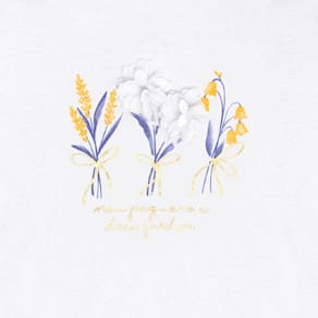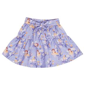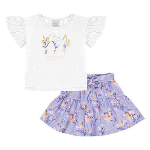 Delicado e especial! O conjunto composto por uma blusa meia malha na cor branca possuí estampa com aplique de flores em foil e a saia em tricoline deixando o look mais leve na cor lavanda com estampa sublimada de fadinhas e elástico no cós deixando mais confortável e seguro.