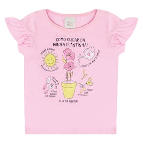 Conjuntinho "Como Cuidar de uma Plantinha" ideal para as pequenas que gostam de ajudar a vovó a cuidar do jardim pois a blusa em meia malha na cor chiclete lumi possuí estampa com desenhos de como cuidar de uma plantinha, mangas bufantes leve e strass acompahada do short saia na cor marinho.