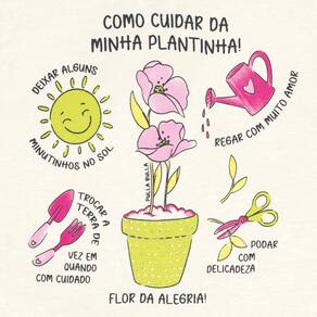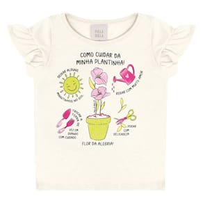 Conjuntinho "Como Cuidar de uma Plantinha" ideal para as pequenas que gostam de ajudar a vovó a cuidar do jardim pois a blusa em meia malha na cor off white possuí estampa com desenhos de como cuidar de uma plantinha, mangas bufantes leve e strass acompahada do short saia na cor pink.