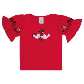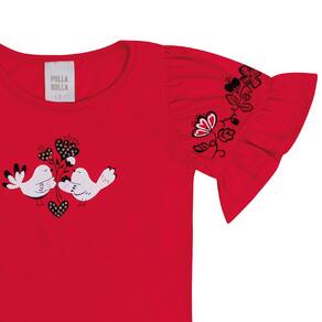 Conjunto composto pela blusa meia malha na cor vermelha com estampa floral junto com strass e pássaros na frontal da peça e nas mangas. O short em moletinho na cor marinho possuí elástico na cintura para maior conforto e movimentação segura e o laço para amarrar possuí miçangas nas pontas. Um verdadeiro charme!