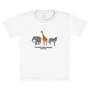 Para o dia a dia, brincar, pular e estar confortável com Pulla Bulla. Conjunto composto por uma camiseta meia malha na branca com estampa de girafa e elefante e escrita "juntos por uma grande aventura. Passeio de safari" e bermuda malha relevo moletinho na cor marinho com bolsos funcionais e elástico no cós.