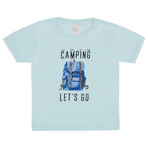 Partiu acampar no quinta da vovó! Nos dias quentes que tal brincar de acampamento vestindo looks fresquinhos e confortáveis, aposte no conjunto. Composto por uma camiseta meia malha na cor céu com estampa de mochila de acampamento e escrita "diga sim ao acampamento divertido. Vamos!" e bermuda moletom linho com estampa sublimado de folhas na cor marinho.