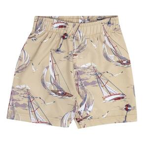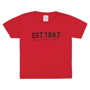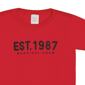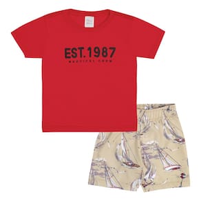 Conjunto ideal para os pequenos fashionistas! Composto pela camiseta meia malha na cor vermelho com estampa em puff escrita "EST.1689" *tradução: Tripulação Náutica desde 1987* e o short nylon na cor areia, sulimado de barquinhos e cós com elastano para maior segurança e conforto na hora de brincar.