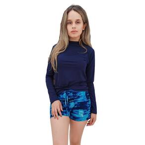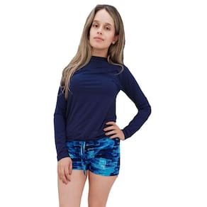 Camiseta com proteção UV50+ e short: Filtra até 98% dos raios solares UVA e UVB. Tecido a base de poliamida (88% poliamida 12% elastano), sendo um tecido leve, com alta respirabilidade, confortável, de secagem rápida e toque suave. É também antibacteriano, o que inibe a proliferação de fungos e bactérias que causam odores desagradáveis, garantindo higiene, conforto e frescor.