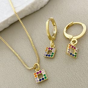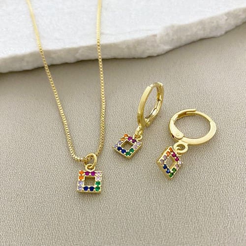 Conjunto Quadrado Cravejado com Zircônia Colorida Banhado a Ouro