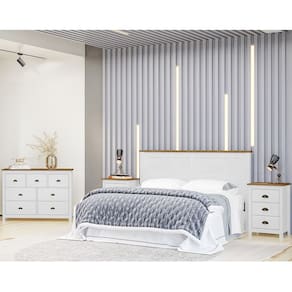 Conteúdo da Embalagem: 1 Cômoda, 1 Cabeceira, 2 Mesas de Cabeceira, manual de montagem e Kit Ferragem