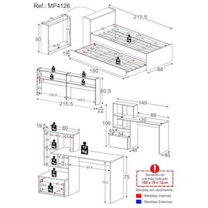 Dimensões do produto montado: Escrivaninha - Altura: 106cm | Largura: 149cm | Profundidade: 48cm Bicama - Altura: 80cm | Largura: 215,5cm | Profundidade: 110cm (aberta) 88cm (fechada) Colchões Indicados: 188cm x 78cm x 12cm *Você pode consultar as medidas detalhadas na imagem técnica do produto.