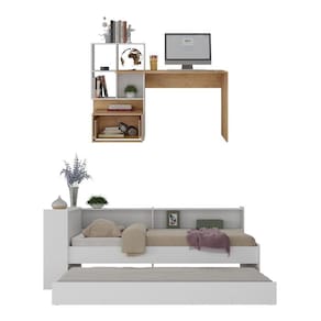 O Conjunto Quarto Bicama Baú com Prateleira e Escrivaninha Multimóveis MP4126 é ideal para criar um design moderno em seu ambiente. Produzidos em MDP com acabamento acetinado (cerca de 20% de brilho), a escrivaninha possui uma gaveta com corrediças metálicas (mais leveza no manuseio), 3 prateleiras para manter o seu ambiente organizado e um tampo espaçoso para equipamentos e materiais de trabalho (suporta até 17Kg). Já a bicama para colchão 78x188cm, também produzida em MDP, possui acabamento em pintura UV tornando-se um produto resistente e com aspecto de por muito mais tempo. Esse conjunto é ideal para quartos pequenos que precisam de otimização de espaço.
