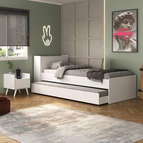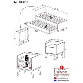 Renove seu ambiente com o Conjunto Quarto Bicama com Baú e Mesa de Cabeceira Retrô Multimóveis MP4120. A mesa de cabeceira é produzida em MDP com acabamento acetinado (cerca de 20% de brilho), que garante maior durabilidade e facilidade na limpeza, possui 1 gaveta com amplo espaço interno e corrediças metálicas que proporcionam mais leveza no manuseio. Os pés retrô, em polipropileno, dão um charme especial ao móvel deixando-o com um visual leve. Já a bicama solteiro para colchão 188x78cm é produzida em MDP com acabamento em pintura UV Premium de alta resistência. Possui um baú embutido com um amplo espaço para acomodar as roupas de cama e outros pertences, deixando o seu ambiente organizado. Bicama suporta até 100kg cama principal / 70kg cama auxiliar e NÃO acompanha colchão.